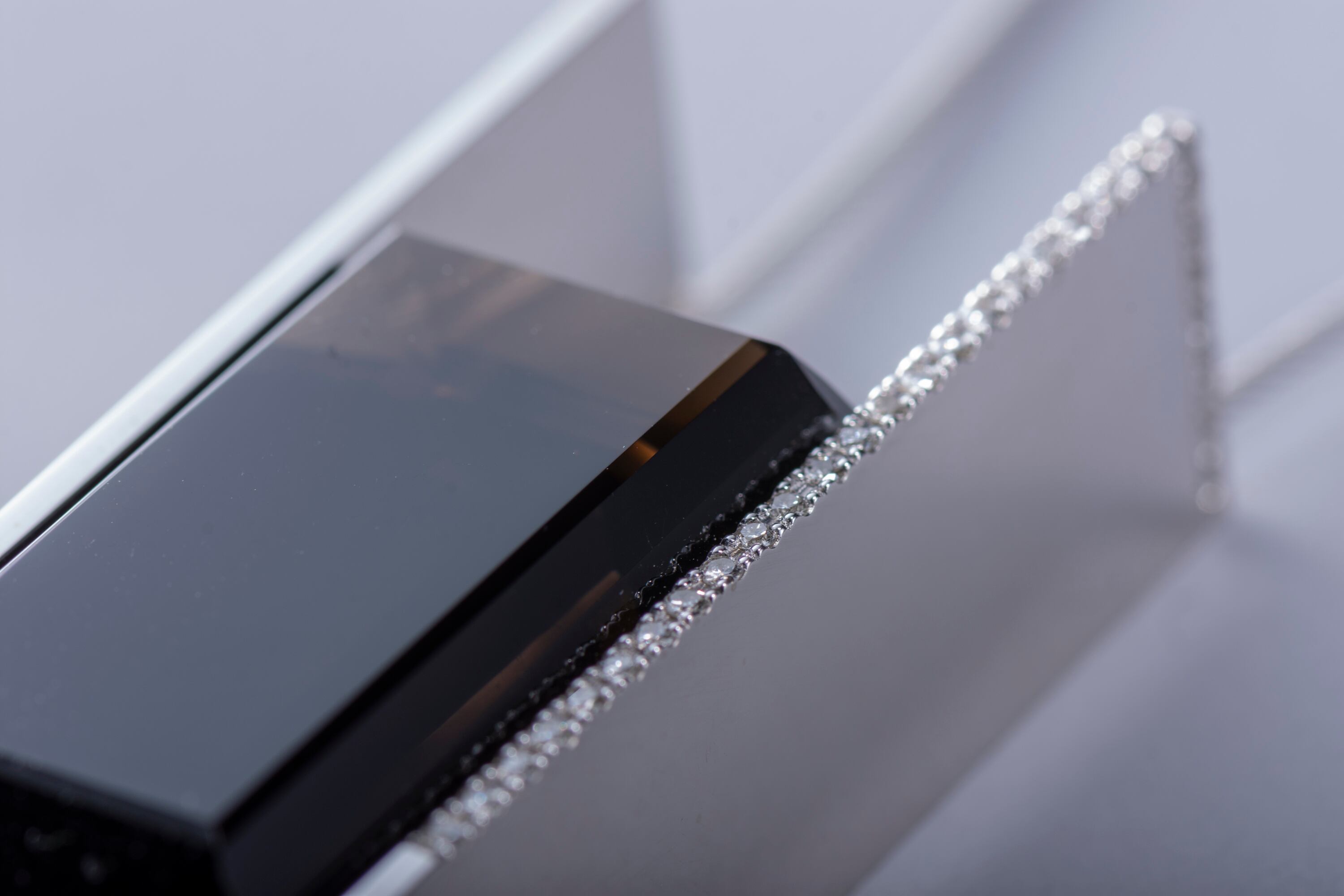 シルバーのプレートで、タテ 3.5㎝ × ヨコ2㎝ × 厚み1㎝ のスモーキクォーツを固定しました。プレートの右側側面の正面に 4.5㎝ の長さと右横のプレートの上部には 1.5㎝ の長さで細かいダイアモンドをあしらい、スモーキークォーツの深い色の魅力を最大限に引き出しています。石の留め方は作家独自の工夫で、石の美しさを最大限に引き出しかつ長期の使用に耐える方法を採用しています。